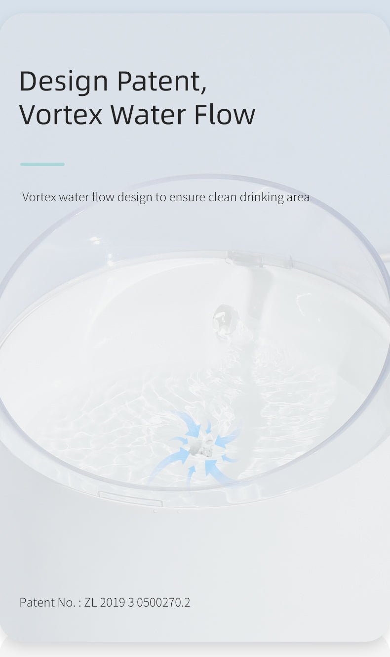 - Patented Water Vortex -A patented water vortex filtrates hair, excess dirt and washes down the fountain walls so you dont have to every time you fill it. Water is also maintained in constant motion to keep it fresh.