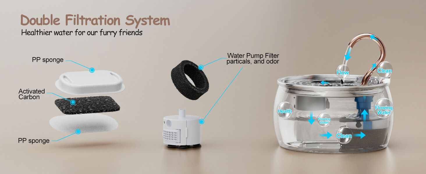 - Double Filtration System: The double-layer filtration system effectively removes impurities, eliminates odors, and softens the water quality, providing your pet with clean and fresh water.