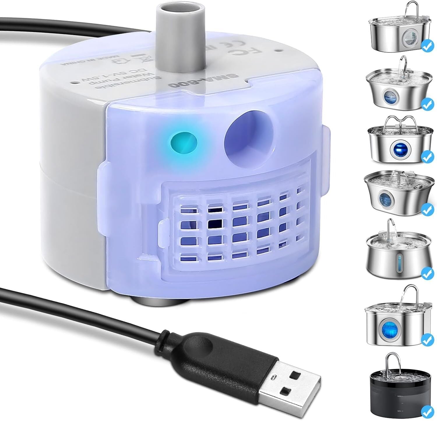 Designed to fit most stainless steel pet water fountains, the SMA-800 replacement pump features a durable DR-DC motor for ultra-quiet performance. Its compact design and USB plug compatibility make it a convenient solution for ensuring your pet's fountain runs smoothly and silently.